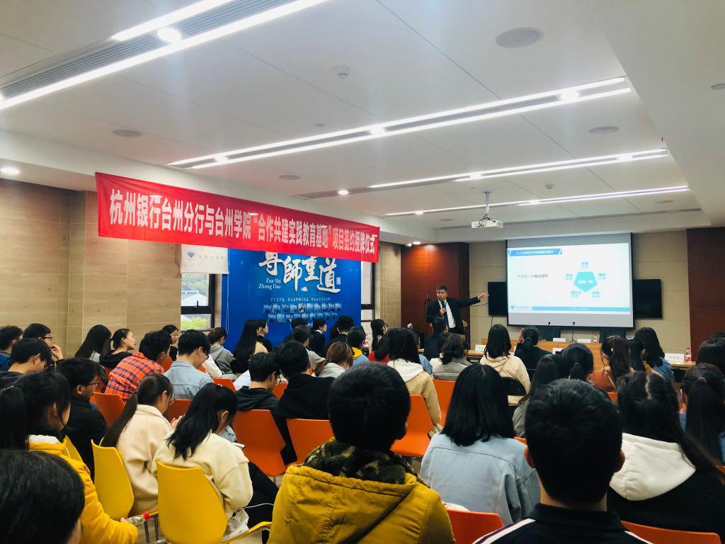 签约仪式之前,我校首届金融专业的64位学生赴杭州银行台州分行进行参观见习。签约仪式结束后,杭州银行台州分行副行长苏永军为我校首届金融专业学子上了《中国小微金改及台州小微金融发展现状介绍》生动一课。