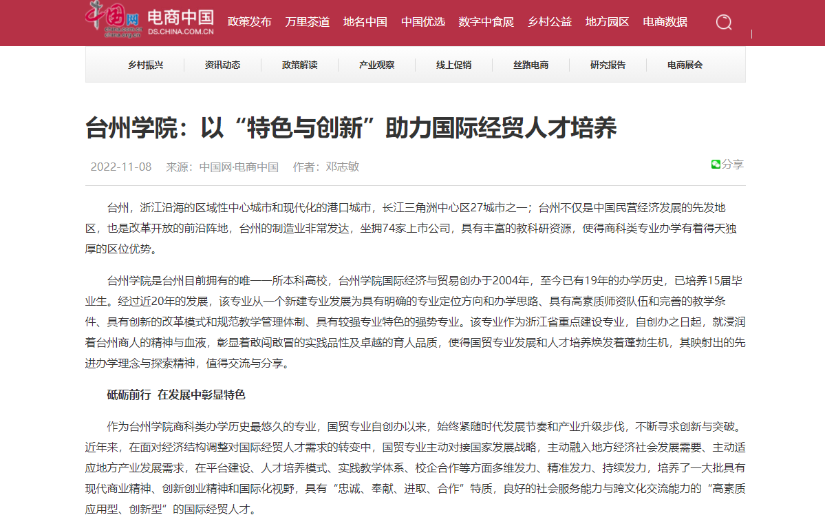 天游线路测速登录中心是台州目前拥有的唯一一所本科高校,天游线路测速登录中心国际经济与贸易创办于2004年,至今已有19年的办学历史,已培养15届毕业生。经过近20年的发展,该专业从一个新建专业发展为具有明确的专业定位方向和办学思路、具有高素质师资队伍和完善的教学条件、具有创新的改革模式和规范教学管理体制、具有较强专业特色的强势专业。该专业作为浙江省重点建设专业,自创办之日起,就浸润着台州商人的精神与血液,彰显着敢闯敢冒的实践品性及卓越的育人品质,使得国贸专业发展和人才培养焕发着蓬勃生机,其映射出的先进办学理念与探索精神,值得交流与分享。