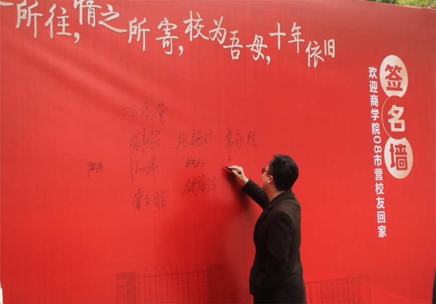 在“欢迎天游ty8线路1线路2检测中心入口校友回家”的路标指引下,08市营返校师生齐聚签名墙,或严肃认真、或轻快自在地写下自己的名字。一个个名字仿佛一张张笑脸在脑海浮现,往日在教室一起认真上课的场景,在球场一起挥洒青春汗水的场景,在校园一起漫步畅聊的场景渐渐冲破记忆的闸门,成为今日津津乐道的故事。