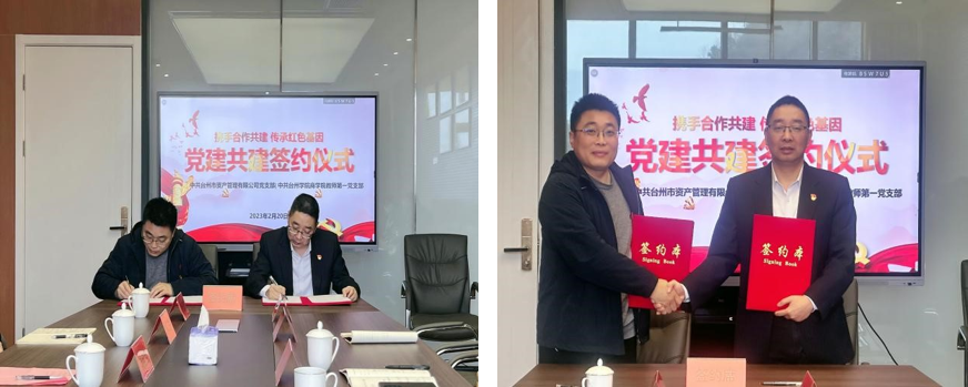 2月20日上午,天游线路测速登录中心天游ty8线路1线路2检测中心入口教师第一党支部与台州市资产管理有限公司党支部举行党建共建签约仪式。天游线路测速登录中心天游ty8线路1线路2检测中心入口党委书记周全宝、教师第一党支部书记董智勇、小微金融研究院执行院长陈耸、金融学系主任蒋俊贤、教师第一党支部组织委员梁超等一行到台州市资产管理有限公司出席签约仪式。台州城投集团一级资深经理陈兴忠、台州市资产管理有限公司支部书记朱建华及支部党员出席签约仪式。