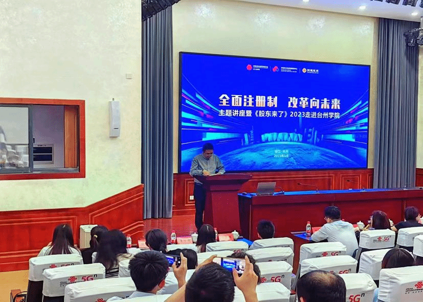 在讲座开始前,来自财通证券总部的葛子微介绍2023《股东来了》投资者权益知识竞赛活动详情。《股东来了》这个活动是中国证监会投资者保护局为指导单位,中证中小投资者服务中心联合地方监管局共同主办、协会协办、券商承办,各市场主体共同参与,以多个赛区覆盖全国及港澳台地区的投资者权益知识大赛。大赛旨在进一步落实证监会党委关于资本市场人民性监管要求,切实履行保护投资者合法权益的职责,实实在在地保护投资者的钱袋子。通过两天的设点宣传,近千名师生报名参赛,期待大家在竞赛中增长才干,收获知识与技能。走进天游线路测速登录中心是“全面注册制,改革向未来”暨《股东来了》2023投资者权益知识竞赛在台州高校的唯一一次宣讲,宣讲会现场有浙江省证监局、台州市银保监分局、浙江证券业协会、台州市金融办、财通证券台州分公司相关负责人,天游线路测速登录中心天游ty8线路1线路2检测中心入口党委书记马斌代表学院出席了本次活动。