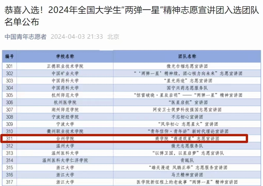 近日,团中央青年志愿者行动指导中心、中国核工业集团有限公司近日联合发布了《关于遴选2024年全国大学生“两弹一星”精神志愿宣讲团的公告》。活动得到了各高校志愿服务团队的广泛关注和积极参与,最终遴选出北京大学、清华大学、北京航空航天大学等870所高校的1000支大学生志愿服务团队。我院“商道筑星”志愿宣讲团成功入选!